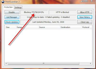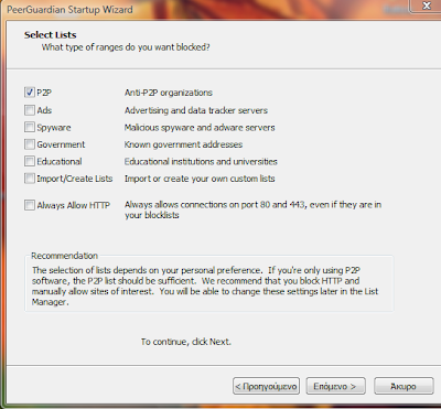 Το PeerGuardian αυτό απευθύνεται κυρίως σ΄όσους ασχολούνται με εφαρμογές p2p(Torrent κ.λπ). Το πρόγραμμα αυτό μας βοηθά να είμαστε αόρατοι στα αδιάκριτα βλέμματα, είναι free και εκείνο που κάνει είναι να κόβει ip διευθύνσεις που έχει στην λίστα του. Είναι πολύ απλό στη χρήση, τρέχουμε το πρόγραμμα και τσεκάρουμε το πάνω κουτάκι όπως φαίνεται πιό κάτω